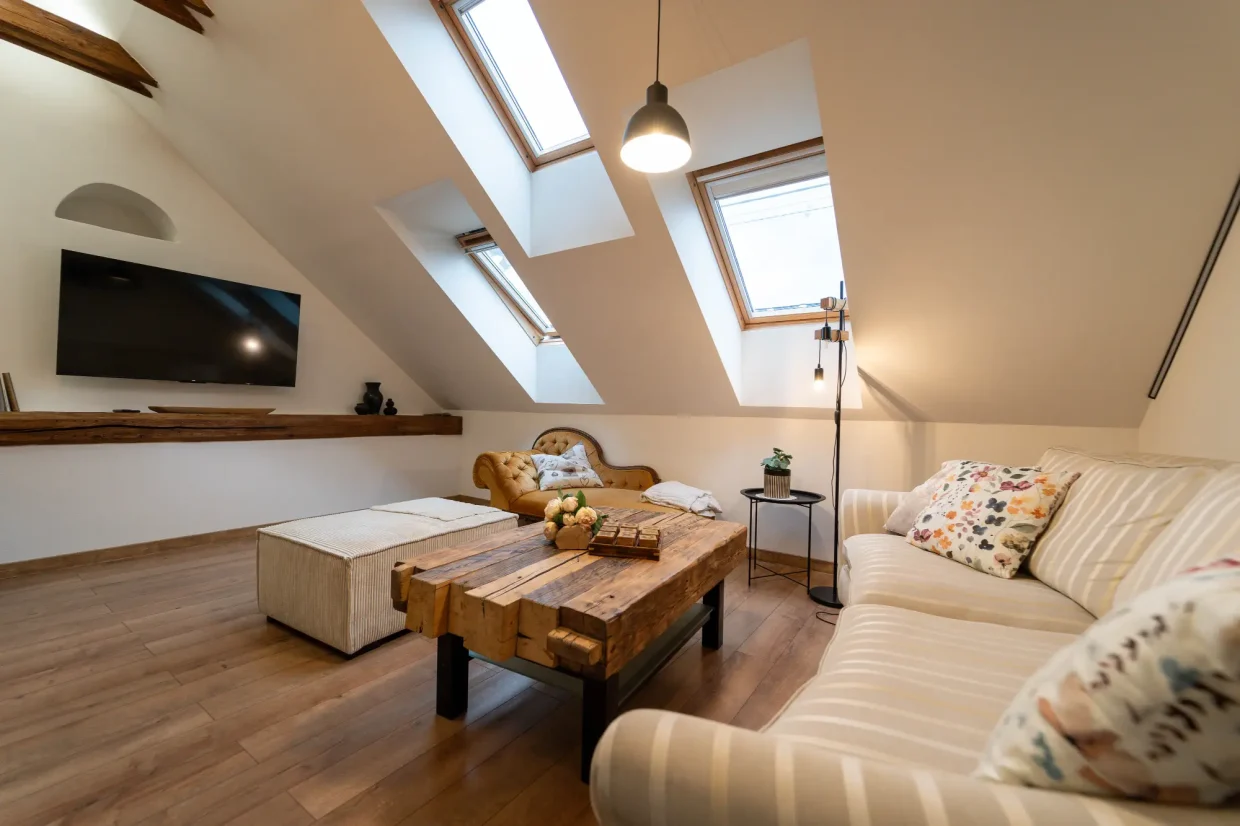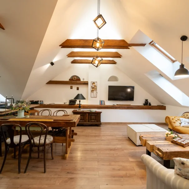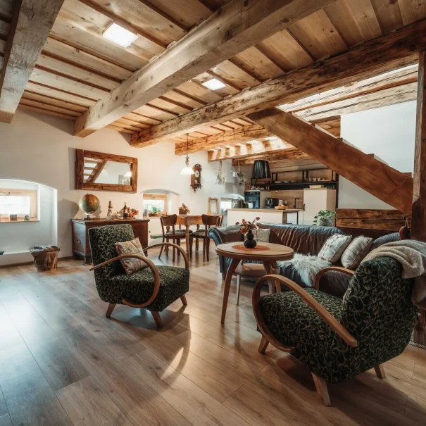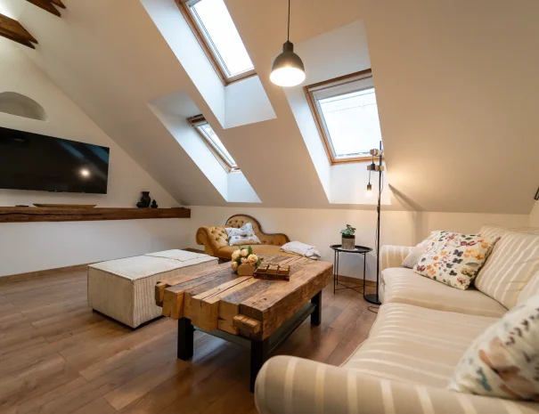 Čákyho kúria ponúka tri samostatné apartmány, ktoré spájajú šarm minulosti s pohodlím dneška. Každý apartmán je jedinečný – od priestranného podkrovného bytu, cez útulný mezonet až po rodinný apartmán s dvomi spálňami. Autentická atmosféra drevených trámov a romantika krbu vytvárajú dokonalé prostredie na oddych počas celého roka.