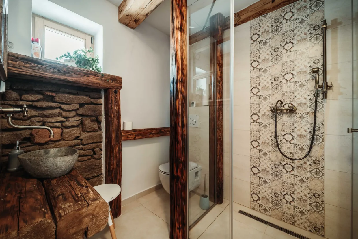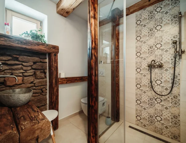 Kúpeľňa so sprchovým kútom a toaletou je k dispozícii hneď pri vstupe do apartmánu.