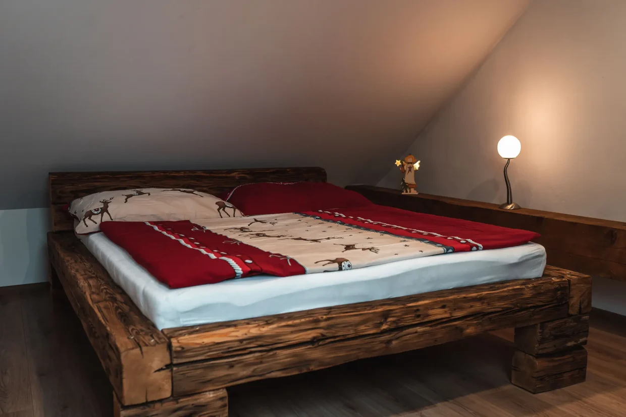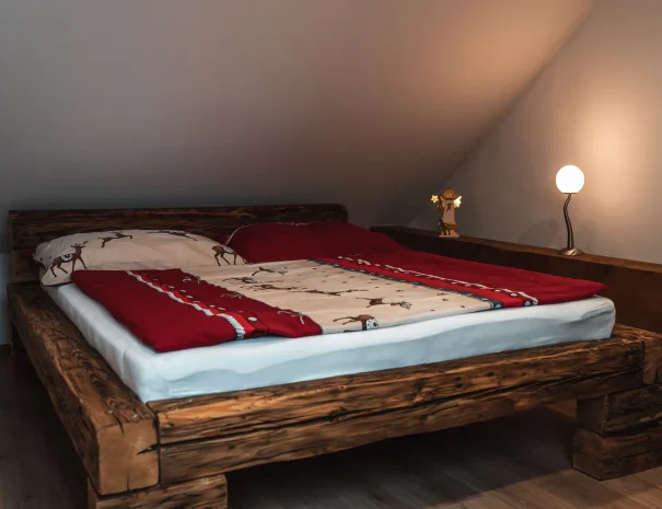 v útulnom podkroví sa nachádza spálňa s manželskou posteľou (160x200) a prechodová izba s písacím stolíkom a rozkladacím gaučom (140x200) pre ďalších dvoch spáčov